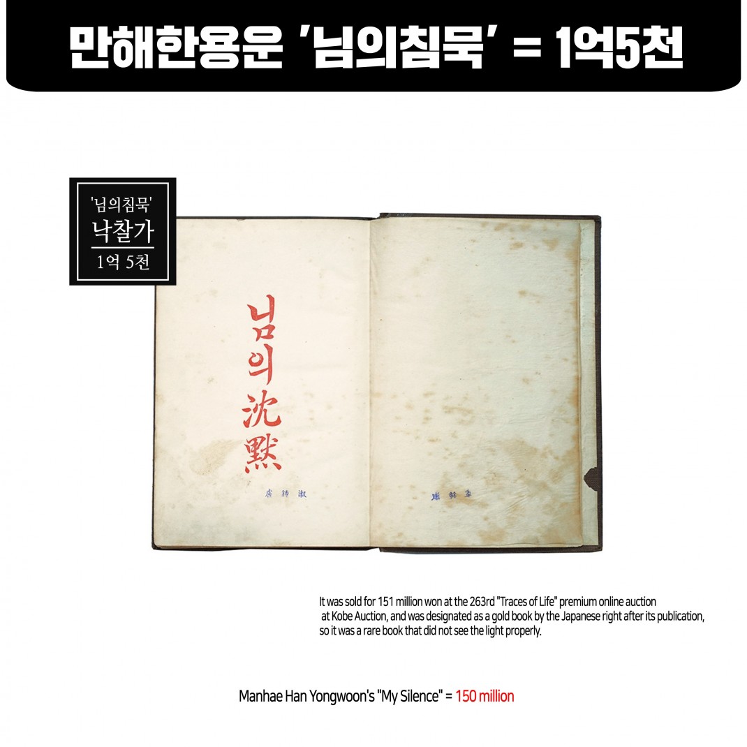 만해 한용운 '님의 침묵' 원본 1억5천 (萬海 韓龍雲 沈黙 1亿5千万韩元) 작성자관리자 등록일 24-11-23 조회268회 본문 중국 명나라시대 의자 210억 낙찰 (中国明朝时期的椅子以210亿韩元成交) 조선백자 달항아리 60억 낙찰 (朝鲜时代月缸成交60亿韩元) 목록